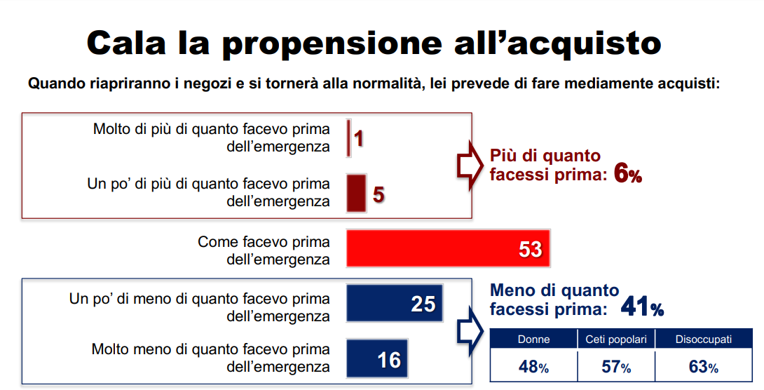 Il 41% degli italiani dichiara che non tornerà a consumare come prima della pandemia e comunque anche chi consumerà come prima lo farà in modo diverso.