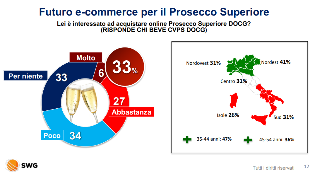 Ben l’81% dichiara inoltre di considerare il Riconoscimento Unesco quale ulteriore attestazione di qualità del prodotto. Infine, il 68% dichiara di essere interessato a pranzi, degustazioni e aperitivi in vigna (68%), attività all’aperto e immersi nella natura, particolarmente ambiti in tempo di lockdown. Ulteriore elemento di interesse, è la domanda su un eventuale interesse per un futuro e-commerce per il Prosecco Superiore, alla quale 1/3 degli intervistati (consumatori della DOCG) si è detto molto e abbastanza interessato.