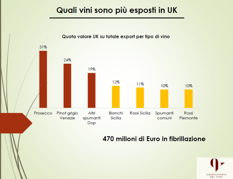 Al focus dedicato agli scenari post-Brexit nel settore vino, anche un’analisi dell’Osservatorio UIV sul mercato del secondo buyer al mondo con 4,4 miliardi di dollari di acquisti dall’estero lo scorso anno. Secondo l’associazione vinicola che rappresenta l’85% del fatturato export del settore, si rischia un’impasse senza precedenti su un mercato strategico che però diventa vitale per alcune importanti denominazioni. È il caso di Prosecco e Pinot grigio, in gran parte prodotti in Veneto, che assieme agli altri spumanti italiani oltre alle Dop piemontesi e siciliane rappresentano il 60% (e l’equivalente di quasi 500 milioni di euro) delle esportazioni di vini italiani in Uk. In particolare, sono gli sparkling la tipologia più coinvolta da potenziali dazi e burocrazia nel primo Paese buyer di bollicine del Belpaese con 2 bottiglie italiane importate su 3, che rappresentano oltre la metà delle vendite tricolori Oltremanica (400 milioni di euro).